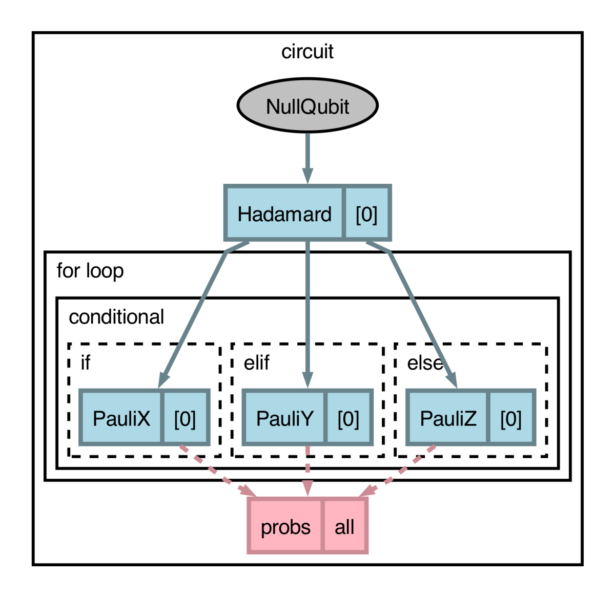 draw_graphfunction can be used to visualize control flow, resulting in a scalable representation that preserves program structure:@qml.qjit(autograph=True) @qml.qnode(qml.device("null.qubit", wires=3)) def circuit(): qml.H(0) for i in range(3): if i == 1: qml.X(0) elif i == 2: qml.Y(0) else: qml.Z(0) return qml.probs()