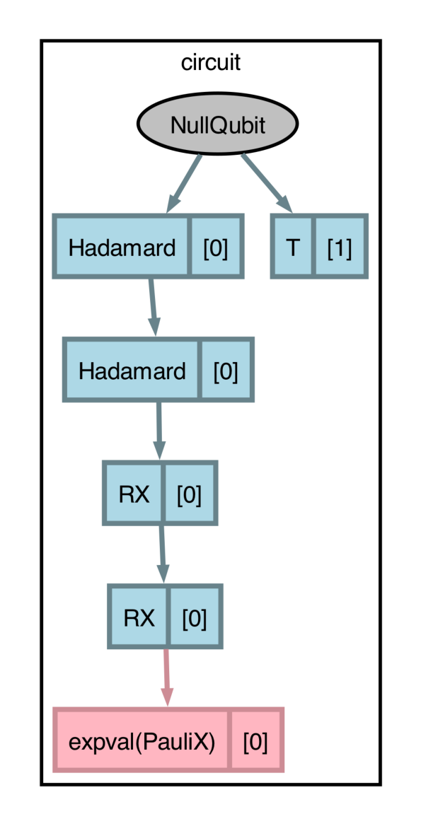 draw_graphrequires a qjit’d QNode and alevelargument, which denotes the cumulative set of applied compilation transforms (in the order they appear) to be applied and visualized.import pennylane as qml import catalyst qml.capture.enable() @qml.qjit @qml.transforms.merge_rotations @qml.transforms.cancel_inverses @qml.qnode(qml.device("null.qubit", wires=3)) def circuit(): qml.H(0) qml.T(1) qml.H(0) qml.RX(0.1, wires=0) qml.RX(0.2, wires=0) return qml.expval(qml.X(0))